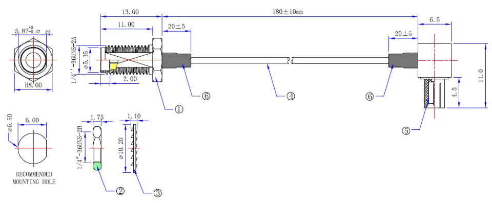 The PTL-100 Patch Cable, SKU 106-CA-P100-TS9SA2.018, is a specialised RF cable designed for applications requiring reliable signal transmission between devices with TS-9 and SMA connectors. This 18 cm cable is part of the L-100 series, featuring a TS-9 male connector with a right-angle body shape and an SMA female connector with a straight bulkhead design. It operates effectively across a frequency range from 0 to 6 GHz, making it suitable for various telecommunications and networking applications where high-frequency signals are involved.