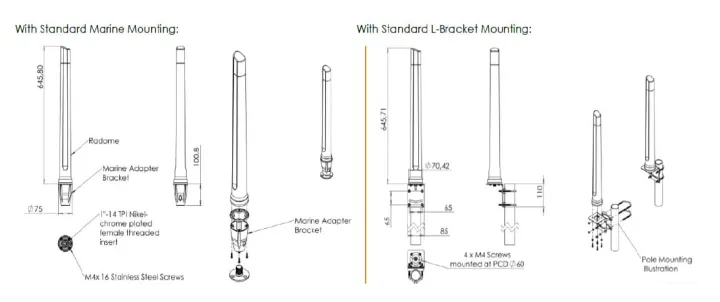 This antenna is ideal for use on yachts, boats, and ferries, where stable and reliable internet connectivity is crucial. It supports various applications, including improved data transmission for IoT and M2M communications, and enhances Wi-Fi performance in areas with poor signal reception. The antenna's future-proof design also covers the lower 450 MHz LTE frequency and the upper 4.2 GHz 5G band, making it versatile for both current and emerging communication technologies.