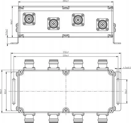 The 106-PCM-HY4-6938.432 is a four-in, four-out hybrid coupler that evenly splits RF input power across four coupled outputs with a nominal 6 dB split. Covering 698–3800 MHz, it supports up to 200 W per port while holding third-order passive intermodulation below –160 dBc and VSWR under 1.25:1. Encased in an IP65 aluminium housing with silver inner conductors, it measures 200 × 90 × 66 mm, weighs 2.1 kg and operates between –25 °C and 65 °C, making it suitable for both indoor and outdoor installations.